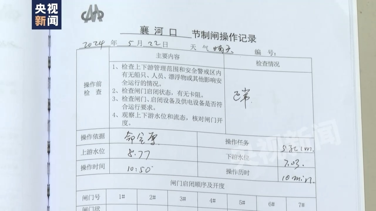 記者在安徽省駟馬山引江工程襄河口閘管理所的節(jié)制閘操作記錄本上看見(jiàn),發(fā)現(xiàn)在5月18日上午,這里的節(jié)制閘原本已處于完全關(guān)閉狀態(tài)。然而在發(fā)現(xiàn)水體污染的兩天后,5月22日上午10點(diǎn)50分,襄河口七孔節(jié)制閘中的五孔開閘,在閘前聚集兩天的污水一路暢通地進(jìn)入滁河。這一次放水直至5月23日15點(diǎn)50分結(jié)束,時(shí)間長(zhǎng)達(dá)29個(gè)小時(shí)。