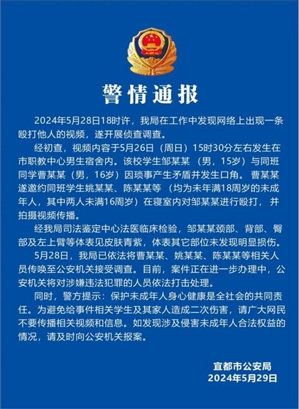 ·湖北宜都警方通報男生遭多名同學(xué)毆打并被拍視頻。