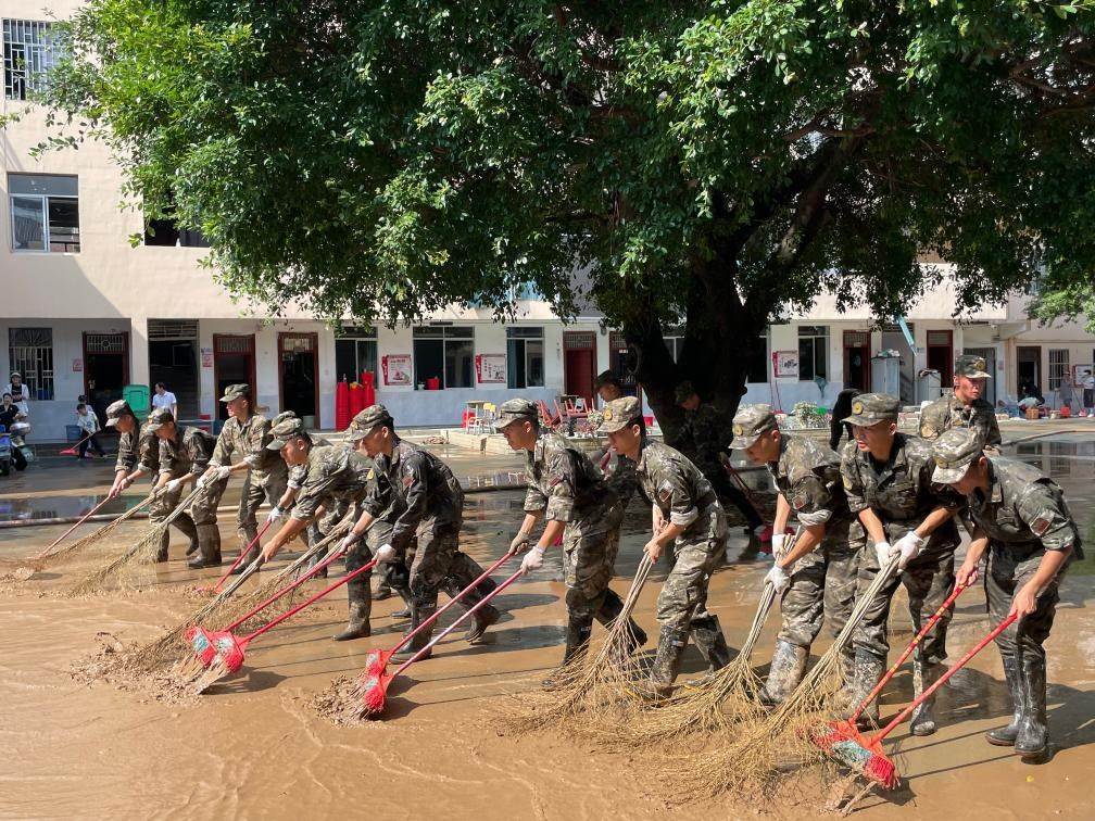 6月21日,武警廣西總隊桂林支隊的武警官兵正在幫助學(xué)校清淤。新華社記者李歡 攝