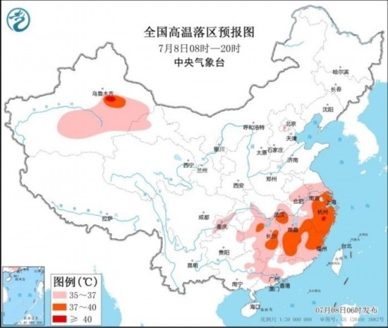 全國高溫落區(qū)預(yù)報圖(7月8日08時-20時)