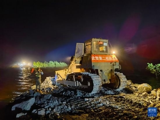 7月7日凌晨,在湖南省岳陽市華容縣團洲垸洞庭湖一線堤防決口處,武警部隊官兵操縱工程機械封堵決口。