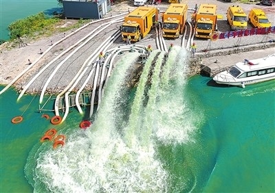 在浙江省臺州市防汛防臺綜合應(yīng)急演練中,市政強(qiáng)排車進(jìn)行作業(yè)。孫金標(biāo)攝(人民圖片)