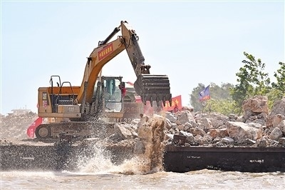 在湖南省岳陽市華容縣團(tuán)洲垸洞庭湖大堤決口現(xiàn)場,搶險隊(duì)伍在進(jìn)行堵口作業(yè)。新華社記者 陳振海攝