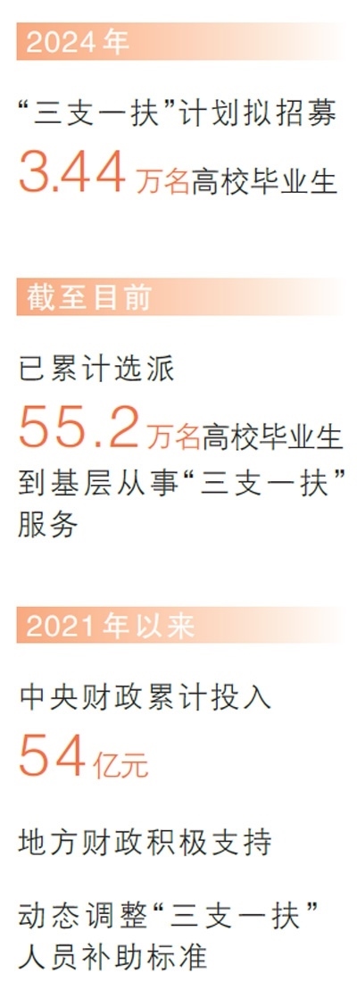 在奮斗中書寫青春華章,在奉獻中成就事業(yè)。2006年“三支一扶”計劃開展以來,50多萬名高校畢業(yè)生扎根鄉(xiāng)村,開展支教、支農(nóng)、支醫(yī)等服務(wù)。2024年,“三支一扶”計劃擬招募3.44萬名高校畢業(yè)生到基層開展相關(guān)服務(wù)。