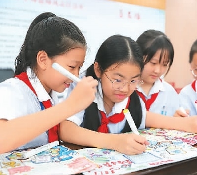 浙江省臺(tái)州市路橋區(qū)螺洋小學(xué)的學(xué)生繪制網(wǎng)絡(luò)安全宣傳手抄報(bào)。蔣友青攝(人民視覺)