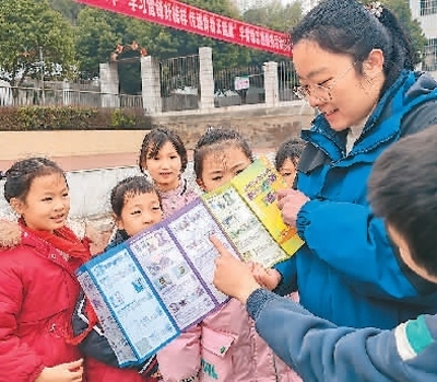 在湖南省江永縣實(shí)驗(yàn)小學(xué),該縣農(nóng)商銀行工作人員為小學(xué)生宣講網(wǎng)絡(luò)金融知識(shí)。潘百旺攝(人民視覺)