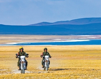 扎西羅布(左)和同事騎車巡邏。