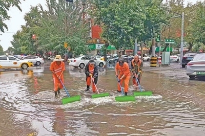 7月26日,遼寧省氣象局發(fā)布暴雨橙色預(yù)警。受強(qiáng)降水影響,遼寧有11個(gè)市啟動(dòng)了防汛應(yīng)急響應(yīng)。圖為26日環(huán)衛(wèi)工人在沈陽(yáng)市街頭清除積水。新華社發(fā)