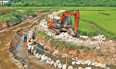 7月26日,湖南省洪江市巖垅鄉(xiāng)竹坪垅村,施工人員加緊修復(fù)被洪水沖毀的溪邊農(nóng)田保坎。楊錫建攝(人民視覺(jué))