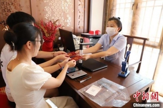 新人在杭州“最美婚登處”領證。蘇瑤 攝