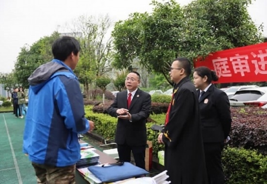 圖為重慶市渝北區(qū)人民法院在一起到企業(yè)現(xiàn)場開庭的勞動爭議案結束后,為勞動者普及法律知識、提供法律咨詢。 劉霞 攝