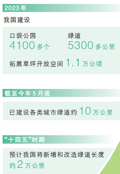 我國(guó)將綠色發(fā)展理念融入城鄉(xiāng)規(guī)劃建設(shè)管理中,穩(wěn)步推進(jìn)建設(shè)連通區(qū)域、城市、社區(qū)的城鄉(xiāng)綠道體系。2023年,我國(guó)建設(shè)口袋公園4100多個(gè)、綠道5300多公里,拓展草坪開放空間1.1萬(wàn)公頃,截至今年5月底,已建設(shè)各類城市綠道約10萬(wàn)公里。