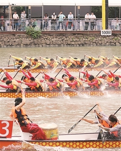 6月1日,第二十屆上海蘇州河城市龍舟邀請(qǐng)賽比賽現(xiàn)場(chǎng),選手在激烈比拼。馬偉勤攝(人民視覺(jué))