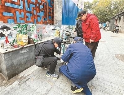“幫把手公益服務隊”的于師傅(左二)為居民修理自行車。本報記者 霍旻含攝