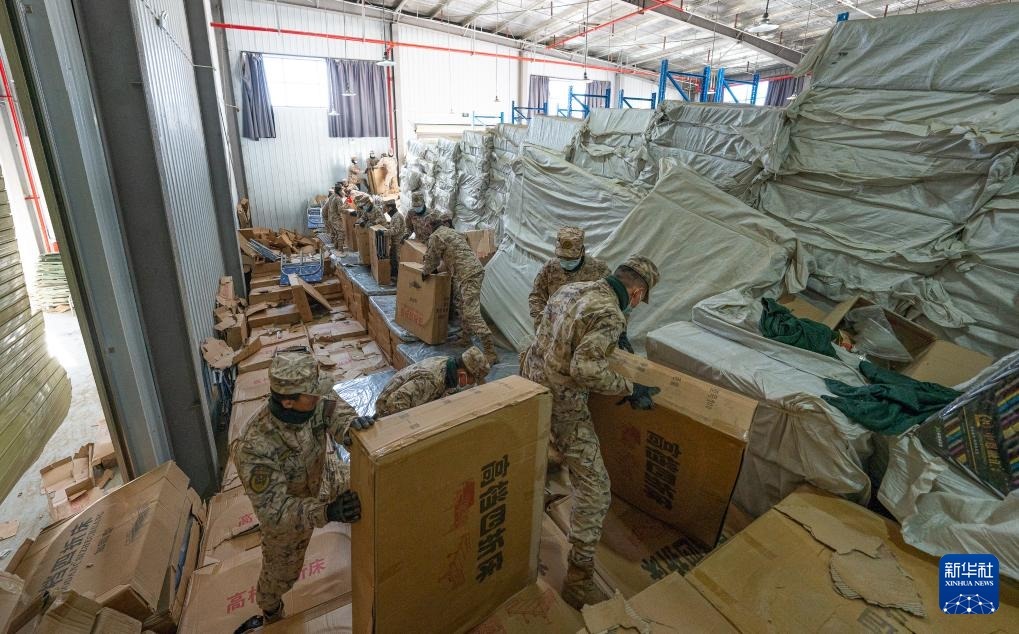 1月8日,在日喀則市經(jīng)開區(qū)物資儲(chǔ)備倉庫,武警官兵在搬運(yùn)抗震救災(zāi)物資。