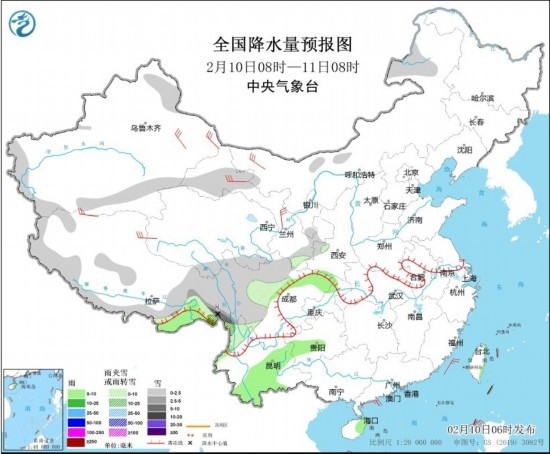 2月10日08時(shí)至11日08時(shí),西藏南部和東部、川西高原、青海南部、甘肅南部、新疆北部和西部、內(nèi)蒙古東部等地部分地區(qū)有小雪或雨夾雪,其中,西藏東部部分地區(qū)有中到大雪(5~8毫米)。四川盆地北部、貴州西部、云南南部和東部、西藏東南部、海南島東部、臺(tái)灣島東部等地部分地區(qū)有小雨。新疆東部、內(nèi)蒙古西部、甘肅北部、青海南部、西藏大部等地的部分地區(qū)有4~6級(jí)風(fēng),其中新疆東部山口風(fēng)力可達(dá)7~8級(jí);臺(tái)灣海峽、巴士海峽、南海大部等海域有6~7級(jí)風(fēng)。