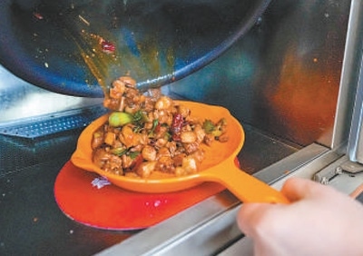 劉楊現(xiàn)場下單了一份干燒雙菇,炒好后,打開柜門的那一刻,香氣撲面而來?!翱隙ū任易约鹤龅暮贸?,比一些餐廳的味道也好。”劉楊說:“如果家中來客,炒3個菜帶回家,總共也就幾十元,比下館子劃算得多。”