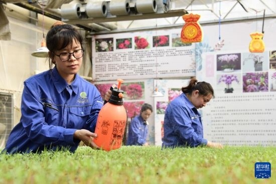 3月20日,在北大荒集團黑龍江綏濱農(nóng)場有限公司溫室內(nèi),工作人員為孔雀草花苗補水。