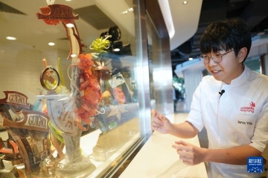 在香港國際廚藝學院西點廚房,姚浩民在介紹“2024年里昂世界技能大賽”西點制作項目的銀牌作品(1月15日攝)。新華社發(fā)(王申攝)
