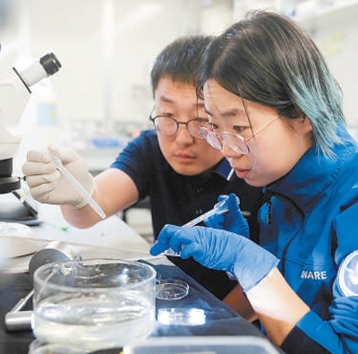 “雪龍2”號科考船上,考察隊(duì)員遲旭朋(左)和武佳星在船載實(shí)驗(yàn)室對南極浮游生物進(jìn)行分樣。
