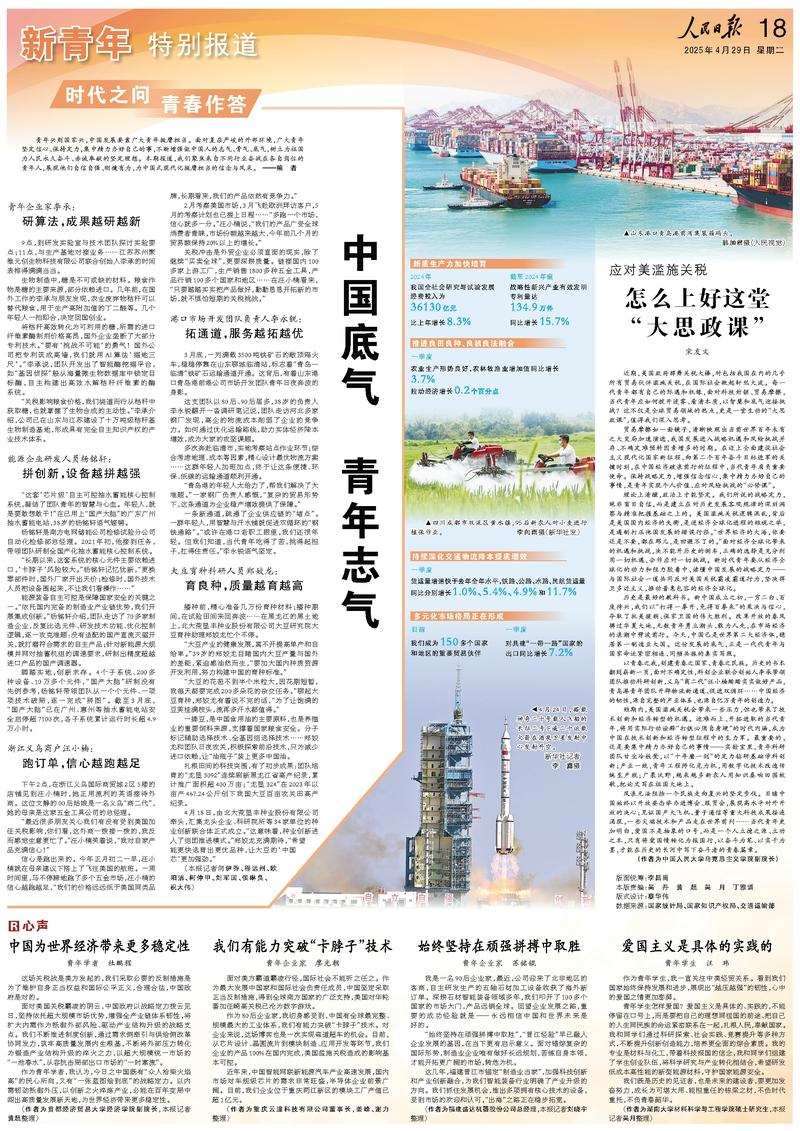 青年興則國家興,中國發(fā)展要靠廣大青年挺膺擔當。面對復雜嚴峻的外部環(huán)境,廣大青年堅定信心、保持定力,集中精力辦好自己的事,不斷增強做中國人的志氣、骨氣、底氣,樹立為祖國為人民永久奮斗、赤誠奉獻的堅定理想。本期報道,我們聚焦來自不同行業(yè)奮戰(zhàn)在各自崗位的青年人,展現(xiàn)他們自信自強、剛健有為,為中國式現(xiàn)代化挺膺擔當?shù)男拍钆c風采。