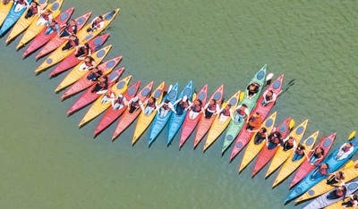 4月25日,重慶市南川區(qū)黎香湖鎮(zhèn)黎香湖皮劃艇基地,游客們在湖里體驗(yàn)水上運(yùn)動樂趣。據(jù)介紹,“五一”假期期間該皮劃艇基地已預(yù)約滿員。