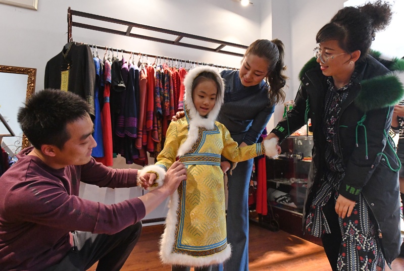 1月8日,首府市民在選購(gòu)蒙古族服飾。臨近春節(jié),蒙古族服飾受到市民的青睞,位于呼和浩特市玉泉區(qū)的昕?jī)x民族服飾工作室里,工作人員忙碌著為顧客選款式、量尺寸,將民族特色和創(chuàng)意時(shí)尚融合在蒙古族服飾制作中,滿足顧客的不同需求。內(nèi)蒙古日?qǐng)?bào)社融媒體記者 王磊 攝