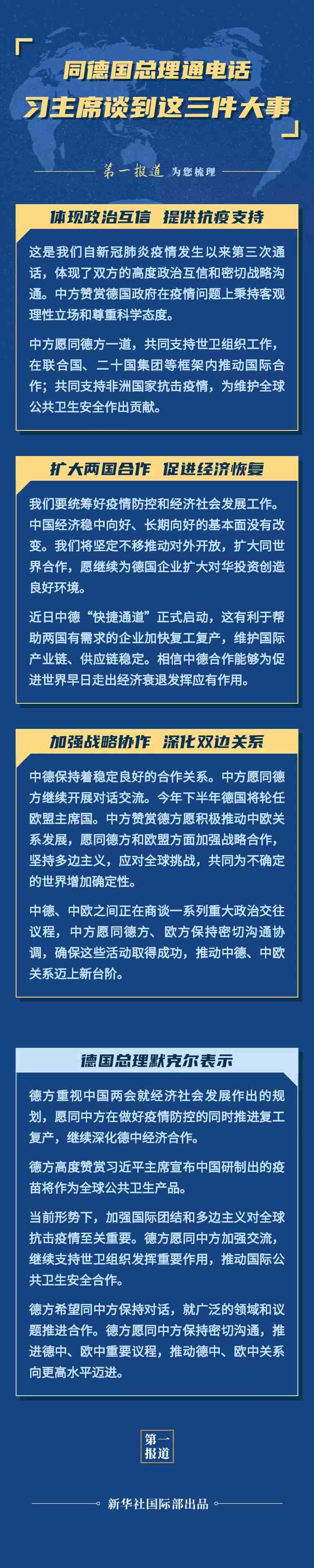 這是自新冠肺炎疫情發(fā)生以來,習(xí)主席同默克爾總理第三次通話。通話信息豐富,“第一報道”為您梳理——