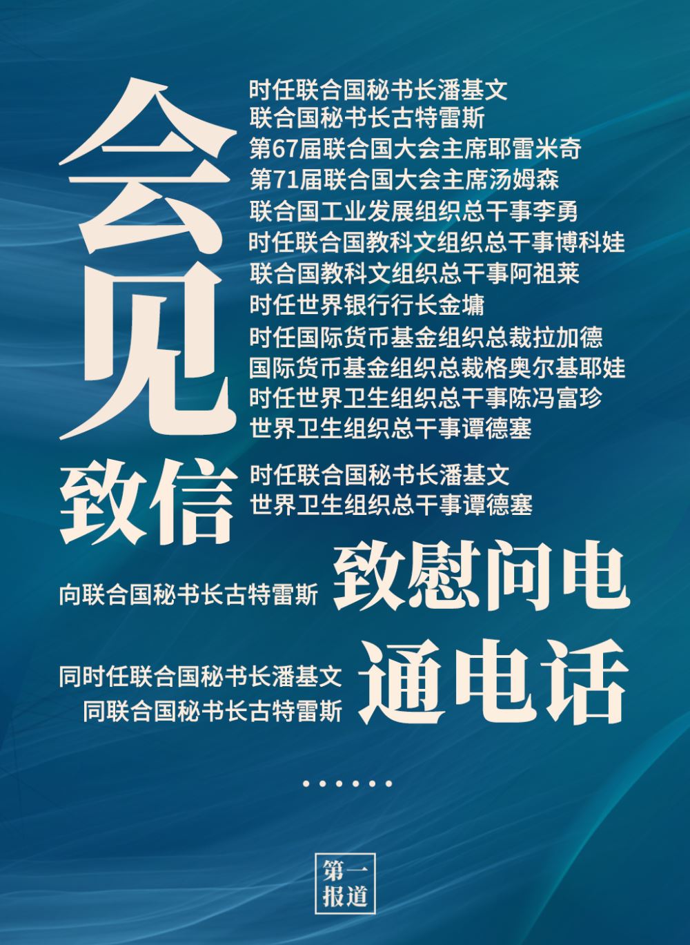 2013年以來,習(xí)主席通過會見、通話、致信函等多種方式同聯(lián)合國主要官員保持密切溝通。互動對象包括聯(lián)合國秘書長、聯(lián)合國大會主席,還有聯(lián)合國工業(yè)發(fā)展組織、聯(lián)合國教科文組織、世界銀行、國際貨幣基金組織、世界衛(wèi)生組織等聯(lián)合國專門機(jī)構(gòu)主要負(fù)責(zé)人。