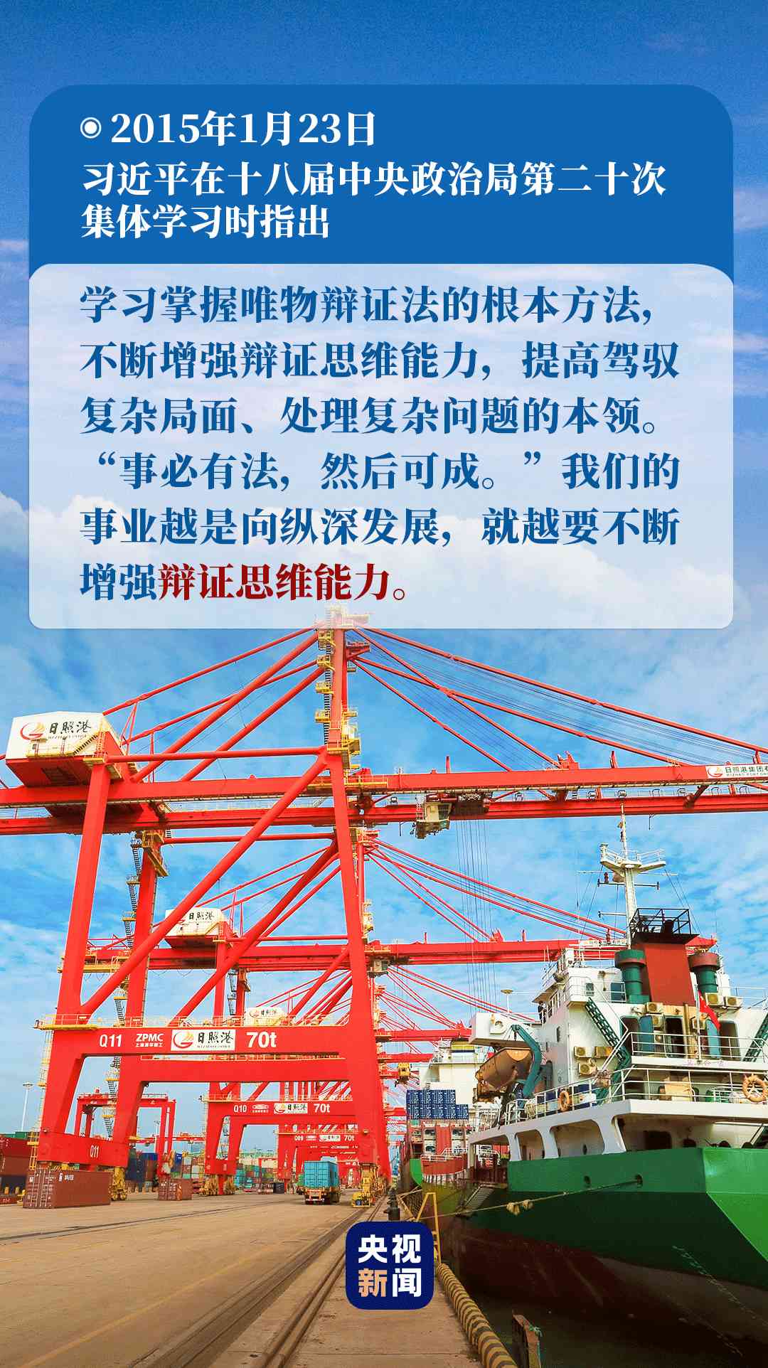 “要堅持發(fā)展地而不是靜止地、全面地而不是片面地、系統(tǒng)地而不是零散地、普遍聯(lián)系地而不是單一孤立地觀察事物,妥善處理各種重大關系?!?015年1月23日,習近平在十八屆中央政治局第二十次集體學習時的講話中,對如何在實際工作中運用唯物辯證法,作出了深刻闡述。