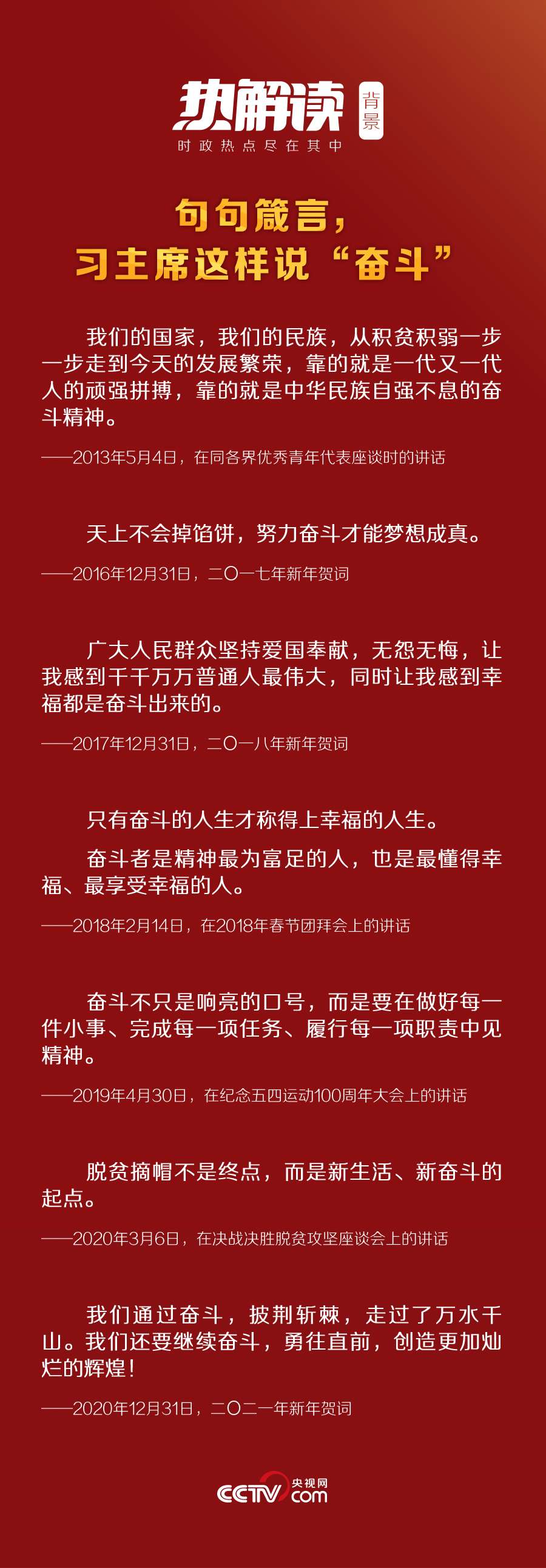 2020年,“十三五”圓滿收官,“十四五”全面擘畫;2021年,既是“十四五”開局之年,又是“兩個一百年”的歷史交匯點,全面建設(shè)社會主義現(xiàn)代化國家新征程即將開啟。在這個關(guān)鍵節(jié)點再次強調(diào)“奮斗”,習近平主席意蘊深遠。