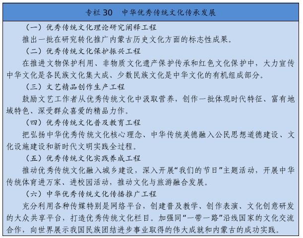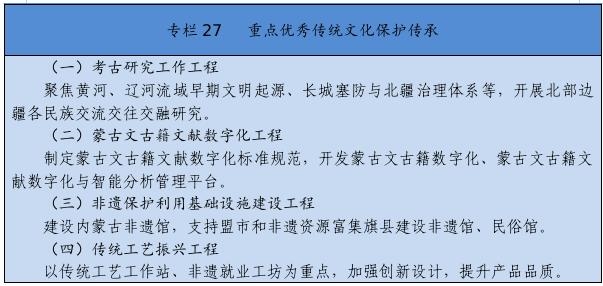 實(shí)施文化遺產(chǎn)系統(tǒng)性保護(hù)工程,強(qiáng)化重要文化和自然遺產(chǎn)、非物質(zhì)文化遺產(chǎn)系統(tǒng)性保護(hù),建立整體保護(hù)、活態(tài)傳承、創(chuàng)新發(fā)展體系。實(shí)施重大文物保護(hù)工程,推進(jìn)長城、黃河國家文化公園和大窯、遼上京、和林格爾土城子等國家考古遺址公園建設(shè)。推動(dòng)萬里茶道(內(nèi)蒙古段)、遼上京和祖陵遺址、紅山遺址群和陰山巖刻申遺。加強(qiáng)阿爾寨石窟寺等石窟文物保護(hù)。開展“中華文明探源”工程、“考古中國”河套地區(qū)早期聚落遺址考古發(fā)掘研究。建設(shè)內(nèi)蒙古非遺博覽園、內(nèi)蒙古黃河文化博物館、內(nèi)蒙古工業(yè)博物館。加強(qiáng)紀(jì)念館、展覽館、博物館建設(shè)管理。推進(jìn)民族優(yōu)秀傳統(tǒng)手工藝保護(hù)傳承和振興,完善非遺名錄體系。實(shí)施中華傳統(tǒng)節(jié)日振興工程,開展傳統(tǒng)節(jié)日禮儀禮節(jié)教育活動(dòng)。