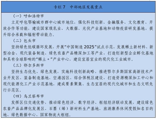 高標(biāo)準(zhǔn)打造稀土新材料、乳業(yè)國家技術(shù)創(chuàng)新中心,在優(yōu)勢(shì)特色產(chǎn)業(yè)領(lǐng)域培育一批國家重點(diǎn)實(shí)驗(yàn)室,布局建設(shè)自治區(qū)重點(diǎn)實(shí)驗(yàn)室、工程研究中心、產(chǎn)業(yè)創(chuàng)新中心、技術(shù)創(chuàng)新中心,構(gòu)建形成創(chuàng)新平臺(tái)體系。高質(zhì)量建設(shè)呼包鄂國家自主創(chuàng)新示范區(qū)、鄂爾多斯國家可持續(xù)發(fā)展議程創(chuàng)新示范區(qū)和巴彥淖爾國家農(nóng)業(yè)高新技術(shù)產(chǎn)業(yè)示范區(qū)。重點(diǎn)實(shí)施國家級(jí)高新區(qū)“提質(zhì)進(jìn)位”行動(dòng),爭(zhēng)取包頭稀土、呼和浩特金山、鄂爾多斯三個(gè)國家級(jí)高新技術(shù)產(chǎn)業(yè)開發(fā)區(qū)在全國高新技術(shù)開發(fā)區(qū)排名晉升5個(gè)位次。開展自治區(qū)級(jí)高新區(qū)“促優(yōu)培育”行動(dòng),推動(dòng)赤峰、阿拉善、通遼高新區(qū)升級(jí)國家級(jí)高新區(qū),打造若干創(chuàng)新資源集聚高地。高質(zhì)量推進(jìn)“科創(chuàng)中國”試點(diǎn)城市建設(shè),大力實(shí)施科技創(chuàng)新賦能行動(dòng),促進(jìn)科技經(jīng)濟(jì)深度融合。