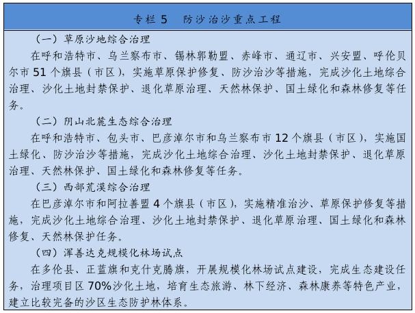 繼續(xù)實(shí)施京津風(fēng)沙源治理等重點(diǎn)工程,推廣庫布其沙漠治理方式和沙產(chǎn)業(yè)模式,推動(dòng)渾善達(dá)克、烏珠穆沁、呼倫貝爾沙地治理。推進(jìn)規(guī)?;謭?chǎng)建設(shè),采取人工造林、封沙育林、飛播造林等方式恢復(fù)植被。建設(shè)荒漠綠洲防護(hù)林、防風(fēng)固沙林、沙漠鎖邊林、農(nóng)田草牧場(chǎng)防護(hù)林以及水土保持林。以干旱半干旱草原為重點(diǎn),加強(qiáng)草場(chǎng)改良和人工種草,實(shí)行圍封禁牧、劃區(qū)輪牧、季節(jié)性休牧、舍飼圈養(yǎng)等措施,保護(hù)和恢復(fù)草原植被。以內(nèi)蒙古高原等為重點(diǎn),推進(jìn)防護(hù)林體系建設(shè)及退化林修復(fù)、退化草原修復(fù)、京津風(fēng)沙源治理。新增水土流失綜合治理3.33萬平方公里。