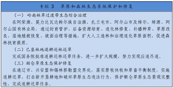 把保護(hù)草原、森林作為首要任務(wù),嚴(yán)格執(zhí)行基本草原保護(hù)制度,落實(shí)草原生態(tài)保護(hù)補(bǔ)助獎(jiǎng)勵(lì)政策,完善草畜平衡和草原禁牧休牧制度。嚴(yán)禁在草原上亂采濫挖、新上礦產(chǎn)資源開發(fā)等工業(yè)項(xiàng)目,已批準(zhǔn)在建運(yùn)營的礦山、風(fēng)電、光伏等項(xiàng)目到期退出,新建風(fēng)電、光伏電站重點(diǎn)布局在沙漠荒漠、采煤沉陷區(qū)、露天礦排土場(chǎng),推廣“光伏+生態(tài)治理”基地建設(shè)模式。開展草原生態(tài)承載能力核定和草原生態(tài)系統(tǒng)健康評(píng)價(jià),實(shí)施草原保護(hù)和修復(fù)重大工程??茖W(xué)開展大規(guī)模國土綠化行動(dòng),實(shí)施三北防護(hù)林體系建設(shè)、公益林保護(hù)、森林質(zhì)量精準(zhǔn)提升等工程,探索大興安嶺一體化保護(hù)模式,推進(jìn)已墾森林草原退耕還林還草,加強(qiáng)森林撫育和退化林修復(fù),提升生態(tài)系統(tǒng)質(zhì)量和穩(wěn)定性。加快構(gòu)建以國家公園為主體的自然保護(hù)地體系。
