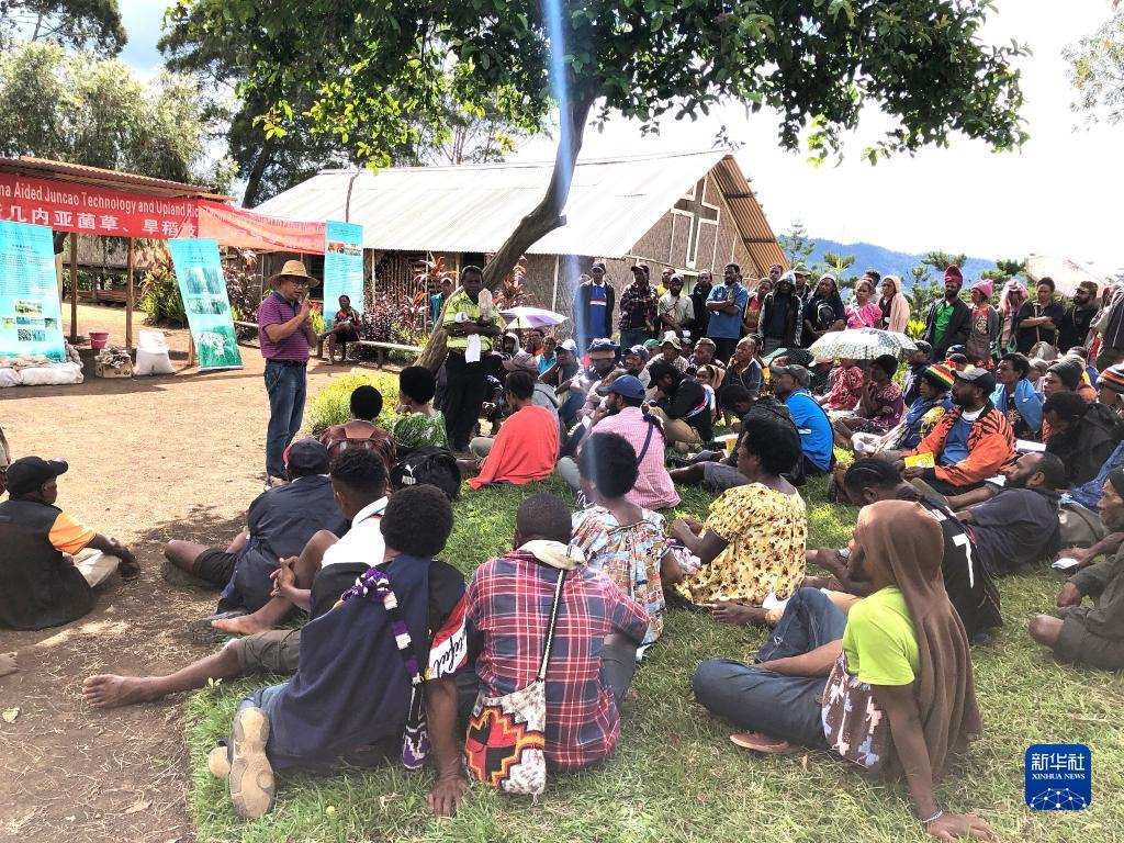 2020年12月15日,中國援巴布亞新幾內亞菌草旱稻項目專家組組長林應興(戴草帽者)在巴布亞新幾內亞東高地省中國援助巴新菌草和旱稻技術項目第9期培訓班上授課。新華社發(fā)