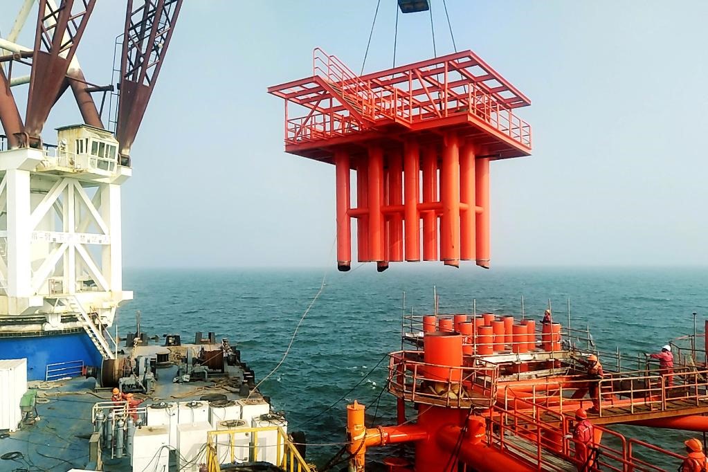 2021年8月21日,中國石化勝利油田海上新建產(chǎn)能項(xiàng)目埕北208井口平臺(tái)吊裝安全就位。(勝利油田供圖)