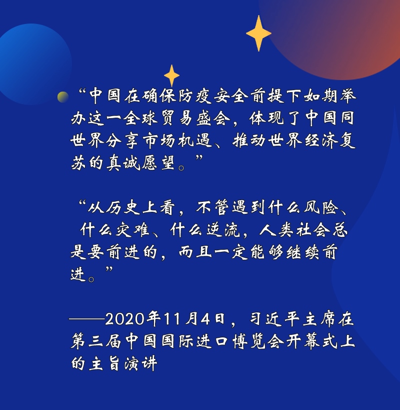 突如其來的新冠肺炎疫情給各國(guó)帶來嚴(yán)重沖擊,也給世界經(jīng)濟(jì)帶來重創(chuàng)。在2020年舉行的第三屆進(jìn)博會(huì)上,習(xí)近平主席誠(chéng)摯的話語,為世界注入強(qiáng)大信心——