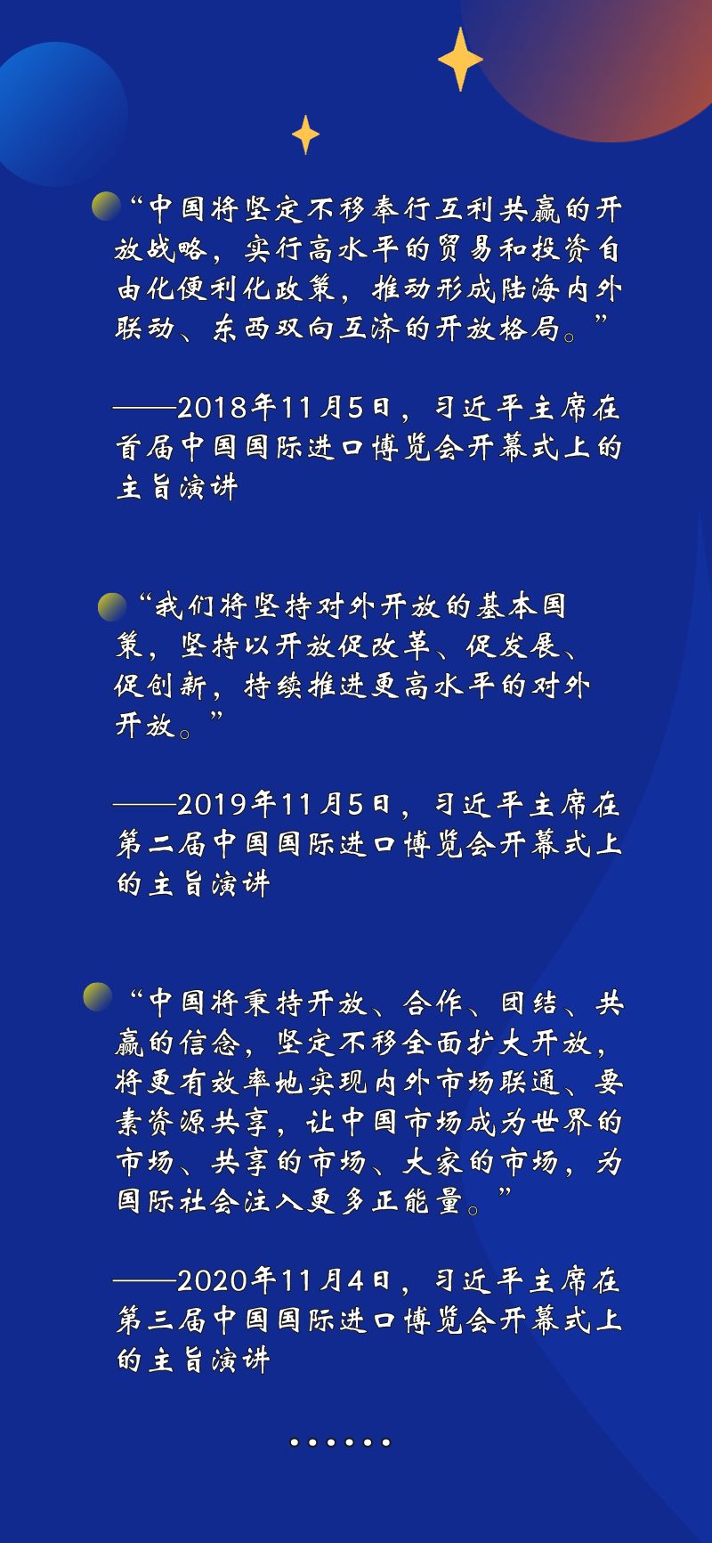 “持續(xù)放寬市場(chǎng)準(zhǔn)入”“繼續(xù)優(yōu)化營(yíng)商環(huán)境”“深化雙邊、多邊、區(qū)域合作”……習(xí)近平主席在進(jìn)博會(huì)上宣布中國(guó)擴(kuò)大開放的一系列重大舉措。