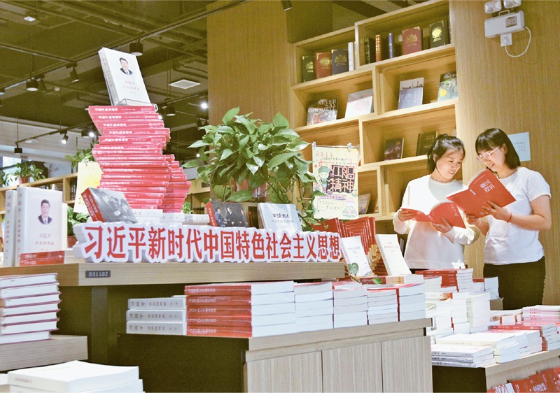 黨確立習(xí)近平同志黨中央的核心、全黨的核心地位,確立習(xí)近平新時(shí)代中國(guó)特色社會(huì)主義思想的指導(dǎo)地位,反映了全黨全軍全國(guó)各族人民共同心愿,對(duì)新時(shí)代黨和國(guó)家事業(yè)發(fā)展、對(duì)推進(jìn)中華民族偉大復(fù)興歷史進(jìn)程具有決定性意義。圖為2021年10月4日,河南省焦作市博愛(ài)縣新華書(shū)店里,讀者在閱讀習(xí)近平新時(shí)代中國(guó)特色社會(huì)主義思想相關(guān)書(shū)籍?!≈行律绨l(fā) 程全/攝
