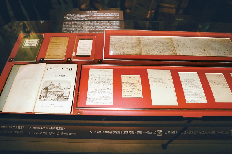 中國(guó)共產(chǎn)黨歷史展覽館的展廳里,陳列著多份珍貴的馬克思手稿。右上為馬克思《布魯塞爾筆記》第四筆記本手稿;右下為馬克思寫(xiě)給《資本論》法文版出版人的六封書(shū)信。 中新社發(fā) 陳曉根/攝