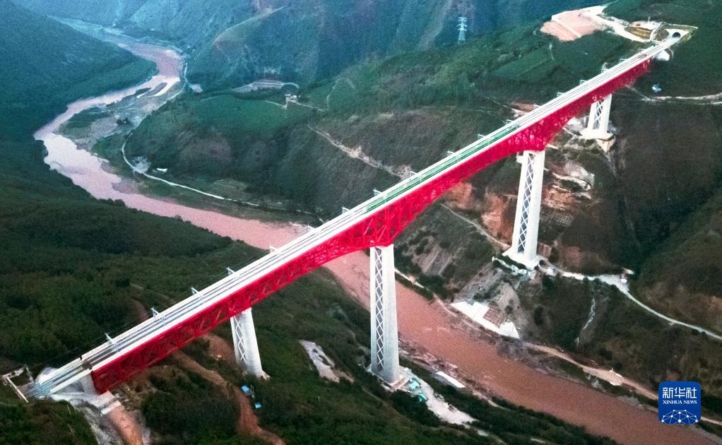 中老鐵路首發(fā)列車駛過中國云南省元江哈尼族彝族傣族自治縣境內(nèi)的元江雙線特大橋(12月3日攝,無人機(jī)照片)。新華社記者王冠森攝
