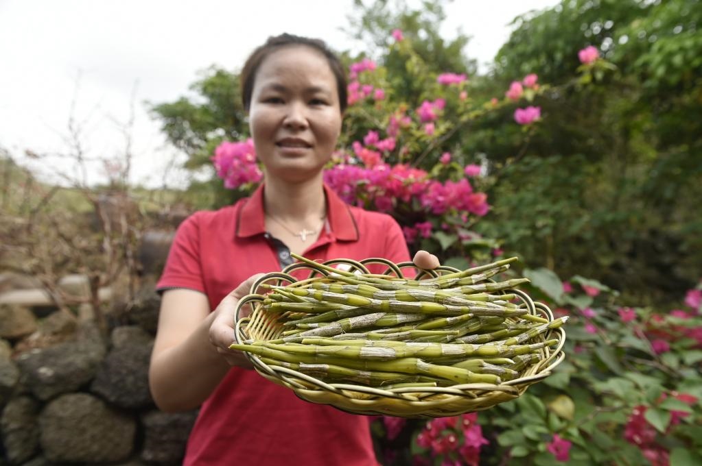 2019年3月14日,村民在海南海口市秀英區(qū)石山鎮(zhèn)施茶村石斛園展示新鮮的石斛。新華社記者魯鵬攝