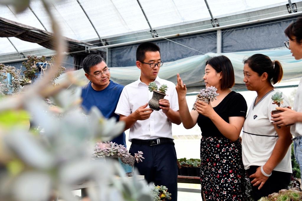 2020年6月9日,在濟南市章丘區(qū)三澗溪村農(nóng)業(yè)創(chuàng)業(yè)園,青年創(chuàng)業(yè)黨支部書記王元虎(左二)和青年黨員一起商量發(fā)展事宜。新華社記者王凱攝