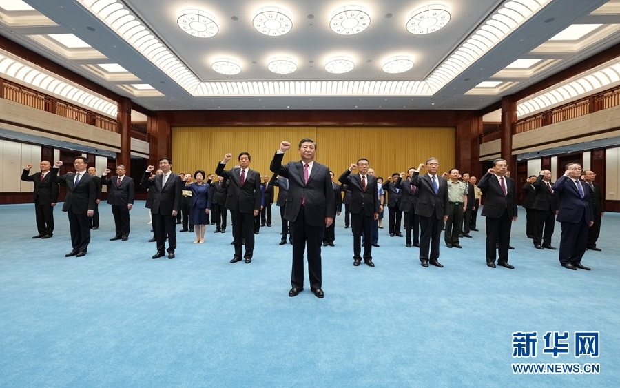 2021年6月18日,黨和國家領(lǐng)導(dǎo)人習(xí)近平、李克強、栗戰(zhàn)書、汪洋、王滬寧、趙樂際、韓正、王岐山等在中國共產(chǎn)黨歷史展覽館參觀“‘不忘初心、牢記使命’中國共產(chǎn)黨歷史展覽”。這是參觀結(jié)束后,習(xí)近平帶領(lǐng)黨員領(lǐng)導(dǎo)同志一起重溫入黨誓詞。新華社記者 李學(xué)仁 攝