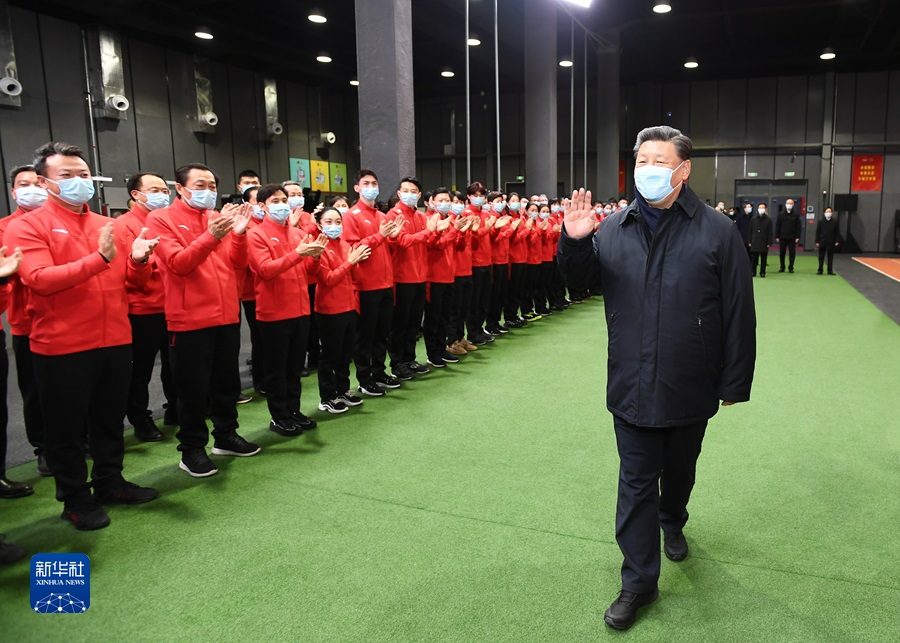 1月4日,中共中央總書記、國家主席、中央軍委主席習(xí)近平在北京考察2022年冬奧會(huì)、冬殘奧會(huì)籌辦備賽工作。這是4日下午,習(xí)近平在二七廠冰雪項(xiàng)目訓(xùn)練基地專項(xiàng)體能訓(xùn)練館,向運(yùn)動(dòng)員、教練員、服務(wù)保障人員揮手致意。新華社記者 謝環(huán)馳 攝