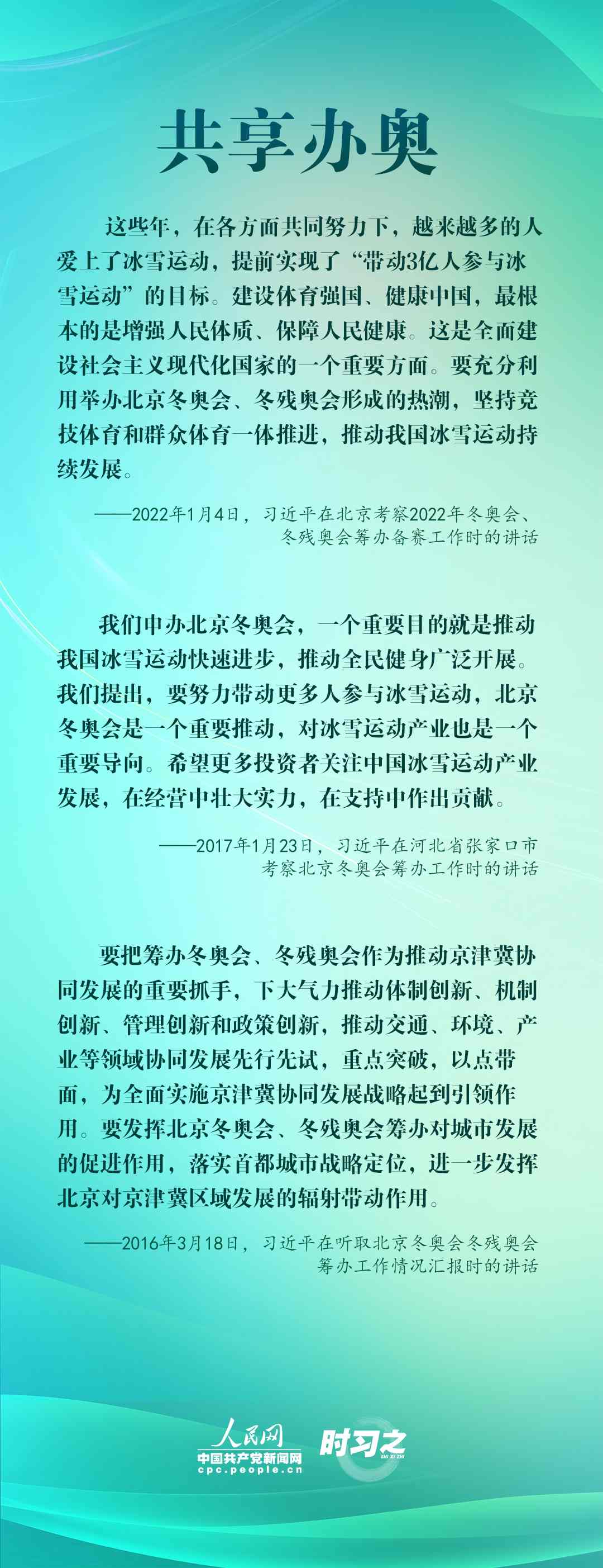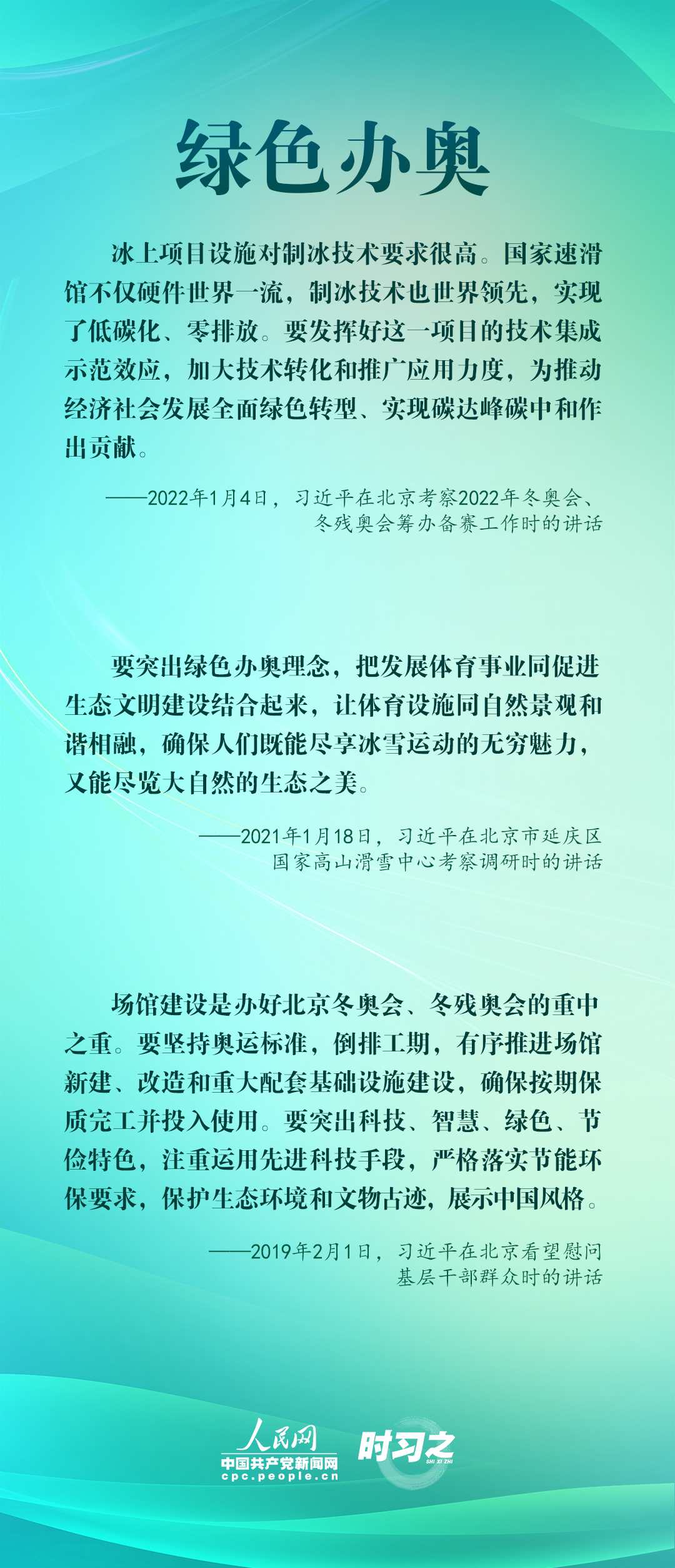 1月4日,習(xí)近平在北京考察2022年冬奧會、冬殘奧會籌辦備賽工作,指出“要堅持綠色辦奧、共享辦奧、開放辦奧、廉潔辦奧的理念,突出科技、智慧、綠色、節(jié)儉特色”。辦好北京冬奧會、冬殘奧會,是中國向國際社會作出的莊嚴承諾。習(xí)近平多次調(diào)研并強調(diào)綠色、共享、開放、廉潔的辦奧理念。