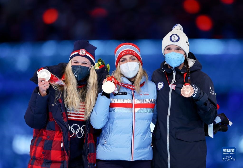 這是越野滑雪女子30公里集體出發(fā)(自由技術(shù))冠軍挪威選手特蕾絲·約海于格(中)、亞軍美國選手杰茜·迪金斯(左)和季軍芬蘭選手凱爾圖·尼斯卡寧在獎牌頒發(fā)儀式上。
