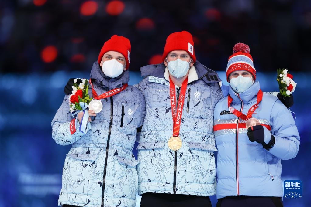 這是越野滑雪男子50公里集體出發(fā)(自由技術(shù))冠軍俄羅斯奧委會選手亞歷山大·博利舒諾夫(中)、亞軍俄羅斯奧委會選手伊萬·亞基穆什金(左)和季軍挪威選手西蒙·赫格斯塔德·克呂格爾在獎牌頒發(fā)儀式上。