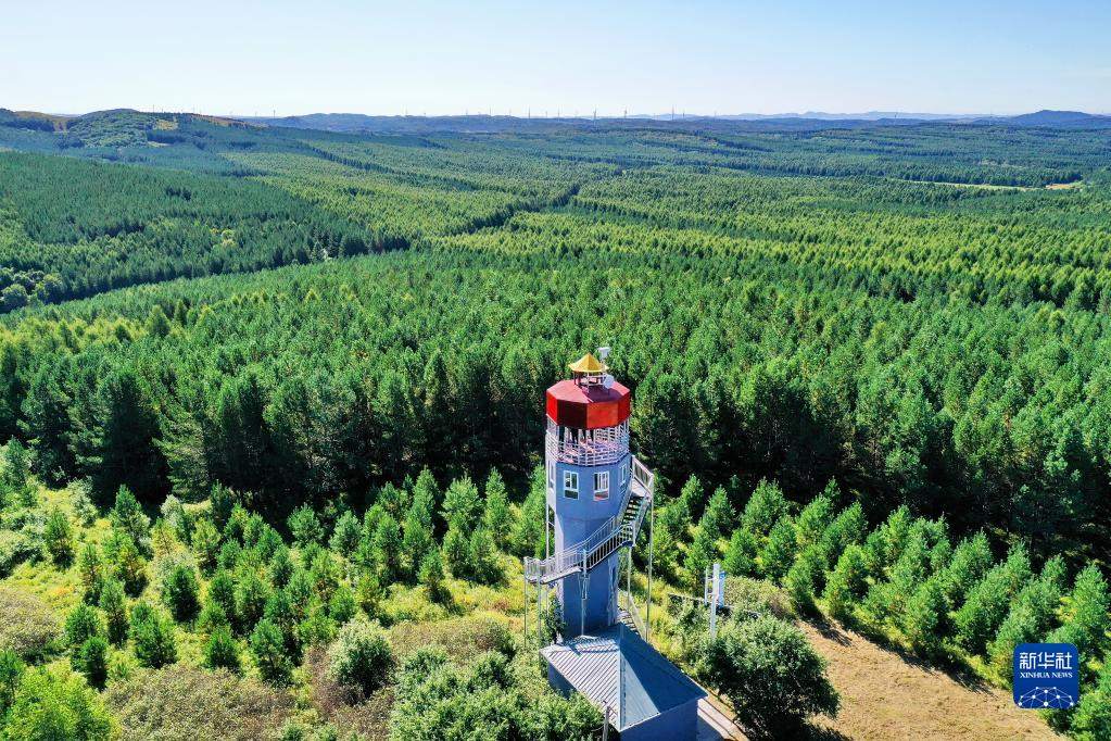 河北塞罕壩機(jī)械林場(chǎng)內(nèi)的望海樓(2021年8月23日攝,無(wú)人機(jī)照片)。新華社記者牟宇攝